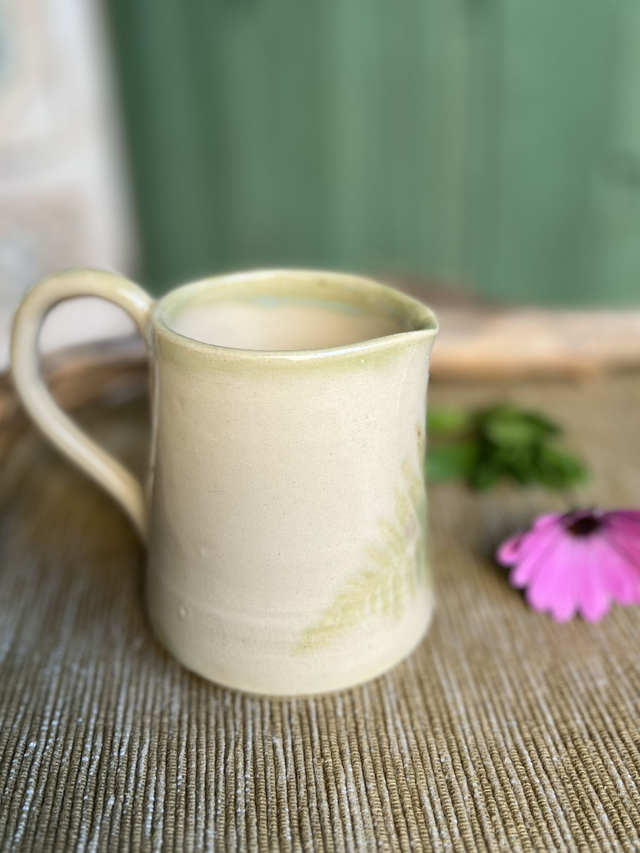 Saucier (ou pot à lait) tourné en grès beige, touche de vert, empreinte d'une feuille de fougère qui rappelle la connection à la nature 🍃