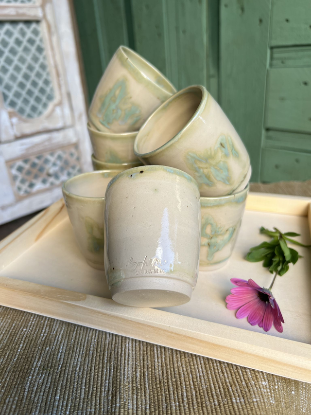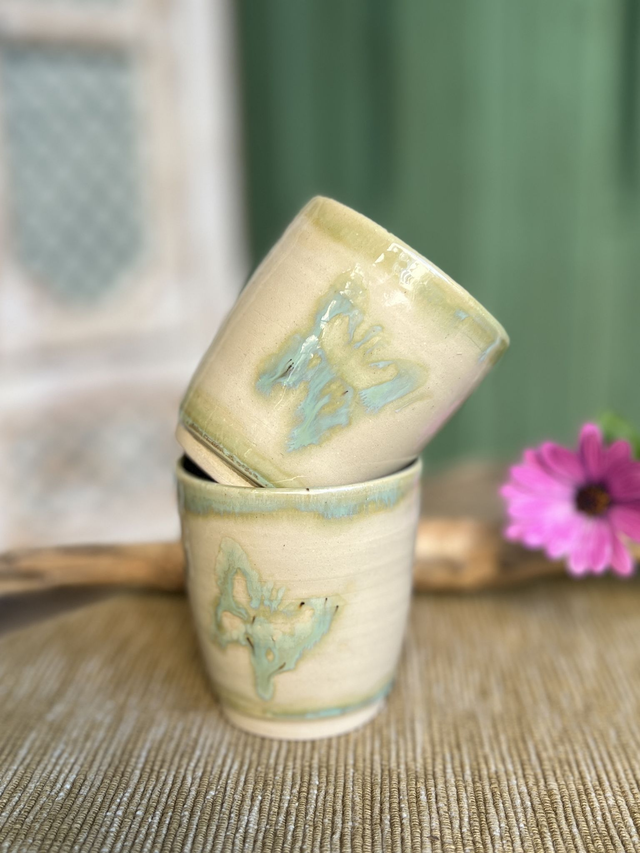Tasse à café tournée en grès beige, touche de vert, emprunte de papillon effet aquarelle. Elle à la taille parfaite standard pour un café lungo ☕️