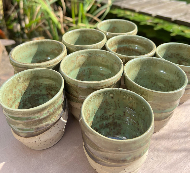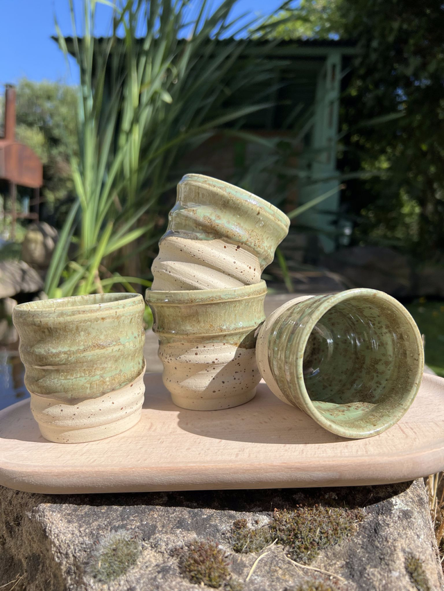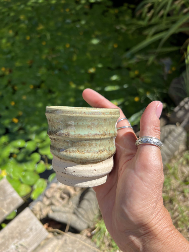 Tourné avec un design texturé dans un grès beige pyrité, j’ai volontairement laissé le bas brut pour garder le côté organique. Le vert moucheté de l’émail rappelle les feuilles du caféier, mais aussi la forêt tropicale et le Brésil 🇧🇷